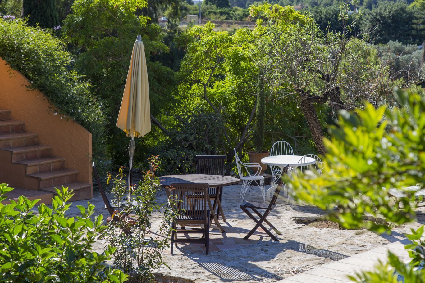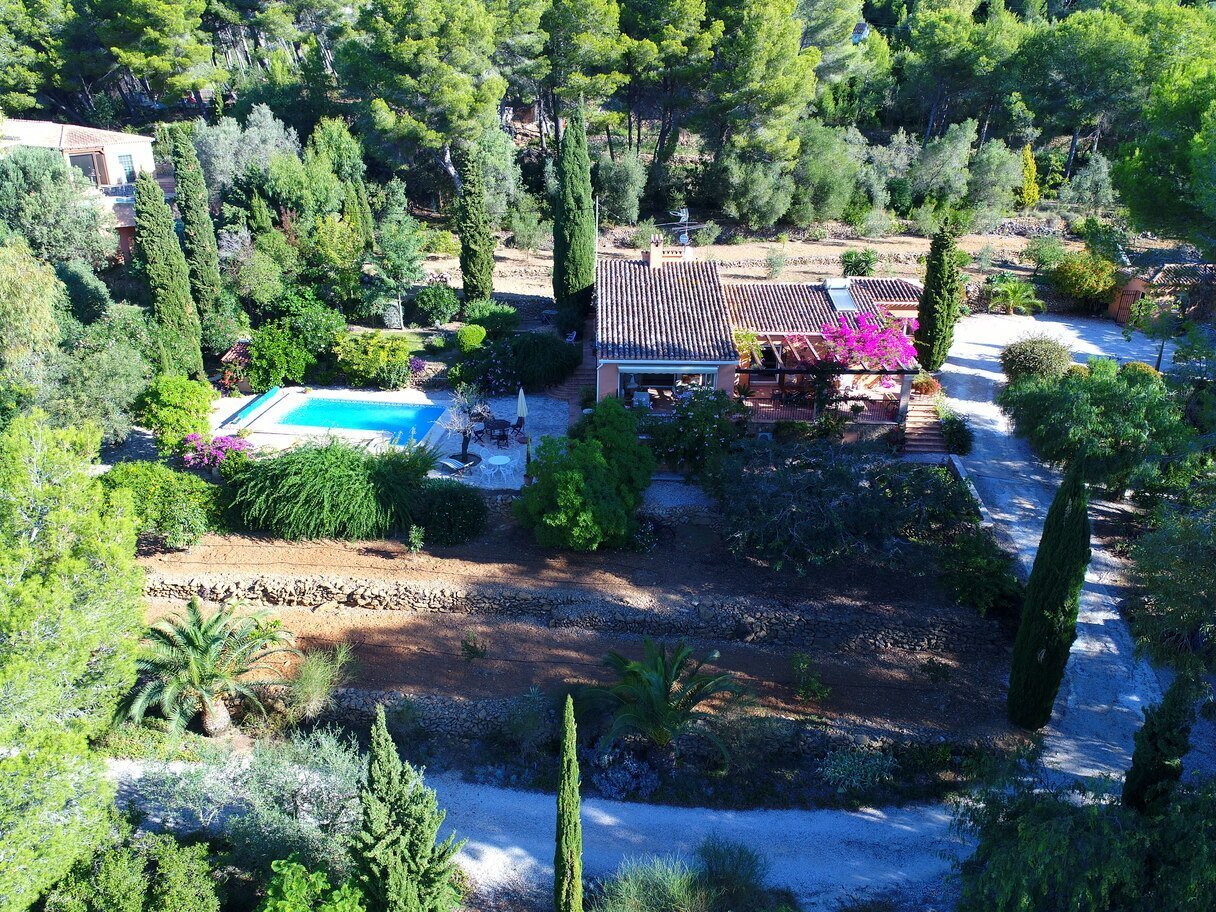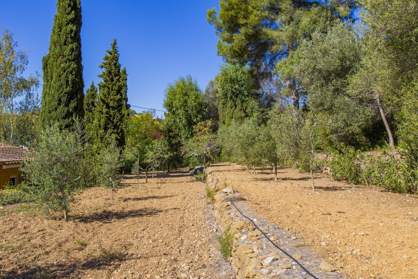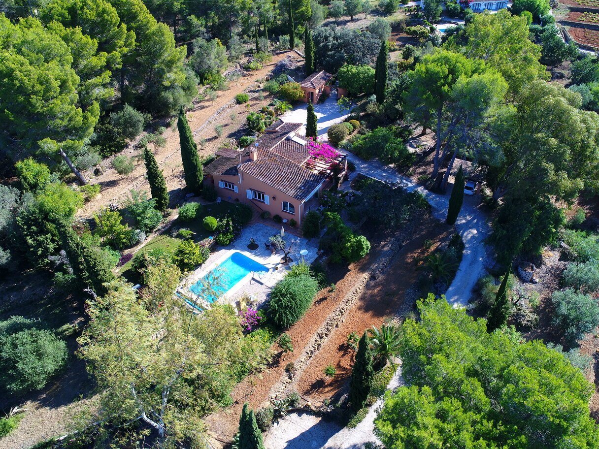 De tuin is een ware mediterrane droom. Rijpe olijfbomen en fruitbomen geven niet alleen schaduw en karakter aan het perceel, maar ook een blijvend gevoel van verbondenheid met de natuur. De oprijlaan, die slingert door een sinaasappelboomgaard, leidt naar de woning en versterkt de landelijke charme van het geheel. Het zwembad ligt in een rustige hoek van het perceel en is volledig omgeven door groene natuur en panoramische uitzichten. Dankzij een slim irrigatiesysteem op lokale watervoorziening is het terrein onderhoudsarm én duurzaam ingericht.