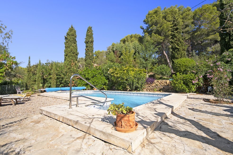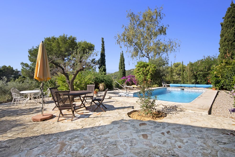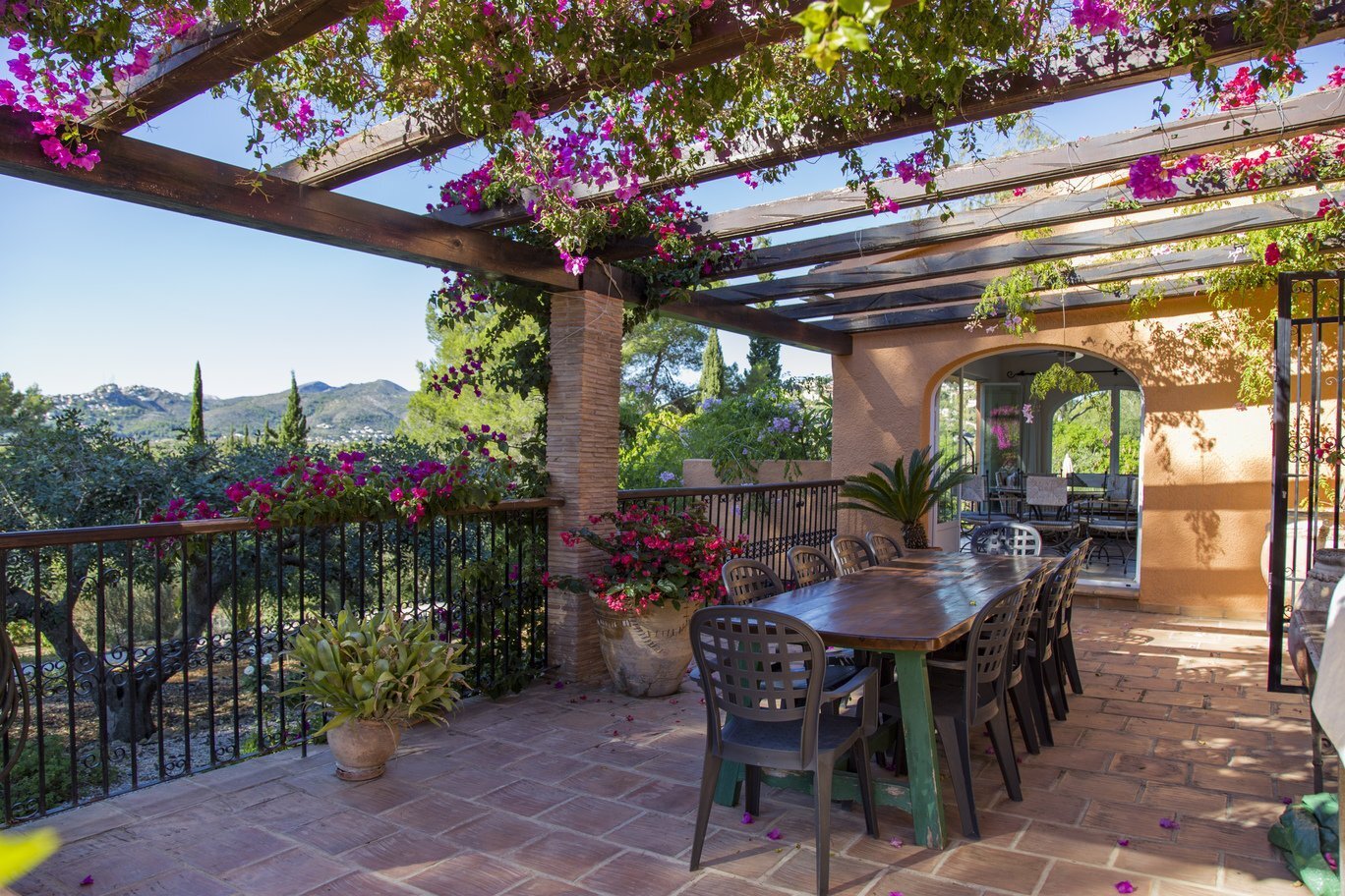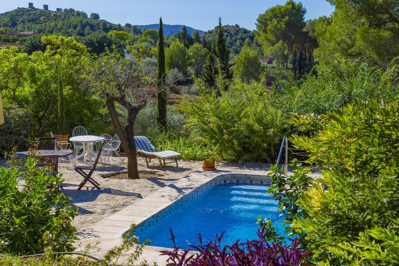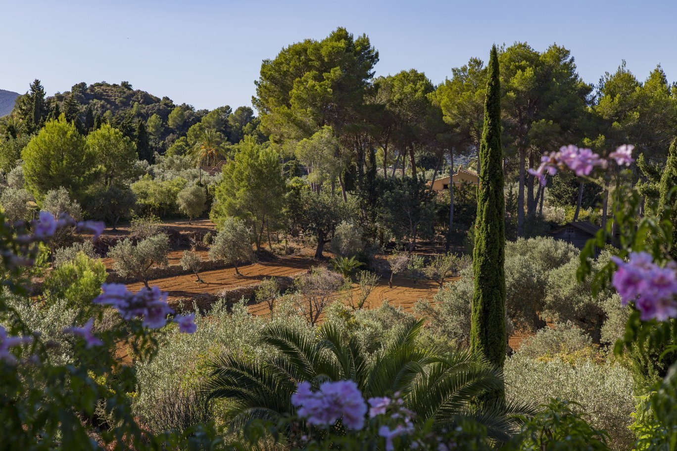 De tuin is een ware mediterrane droom. Rijpe olijfbomen en fruitbomen geven niet alleen schaduw en karakter aan het perceel, maar ook een blijvend gevoel van verbondenheid met de natuur. De oprijlaan, die slingert door een sinaasappelboomgaard, leidt naar de woning en versterkt de landelijke charme van het geheel. Het zwembad ligt in een rustige hoek van het perceel en is volledig omgeven door groene natuur en panoramische uitzichten. Dankzij een slim irrigatiesysteem op lokale watervoorziening is het terrein onderhoudsarm én duurzaam ingericht.