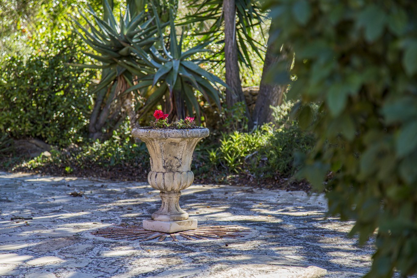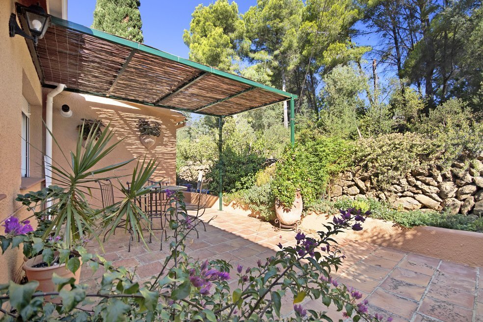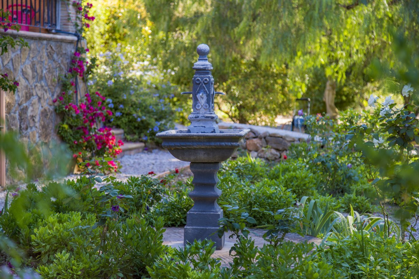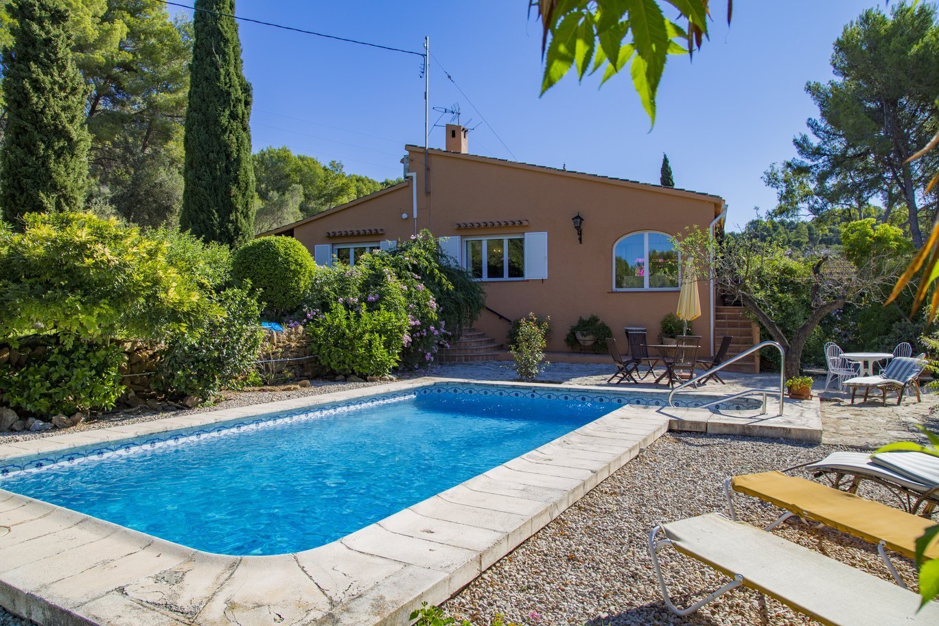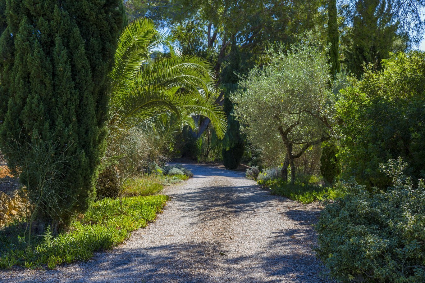 De tuin is een ware mediterrane droom. Rijpe olijfbomen en fruitbomen geven niet alleen schaduw en karakter aan het perceel, maar ook een blijvend gevoel van verbondenheid met de natuur. De oprijlaan, die slingert door een sinaasappelboomgaard, leidt naar de woning en versterkt de landelijke charme van het geheel. Het zwembad ligt in een rustige hoek van het perceel en is volledig omgeven door groene natuur en panoramische uitzichten. Dankzij een slim irrigatiesysteem op lokale watervoorziening is het terrein onderhoudsarm én duurzaam ingericht.