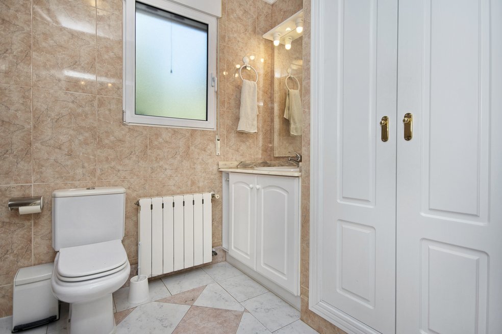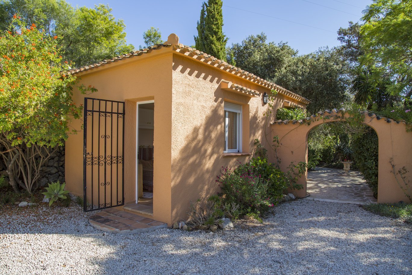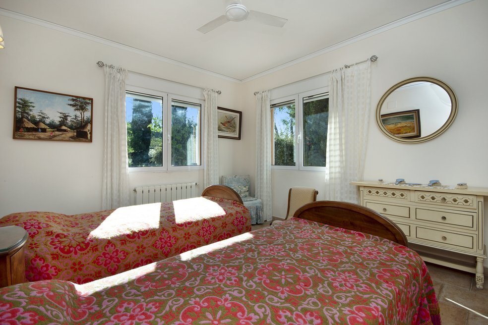 Het hoofdverblijf telt drie royale tweepersoonsslaapkamers, elk met ingebouwde kasten. Een van de kamers beschikt over een eigen en-suite badkamer, terwijl een tweede, complete badkamer beschikbaar is voor algemeen gebruik. Iets apart van de hoofdwoning ligt een zelfstandig gastenverblijf met een aparte slaapkamer en badkamer. Deze ruimte biedt volop mogelijkheden voor het ontvangen van logés of als afzonderlijke accommodatie met potentieel voor verhuur.