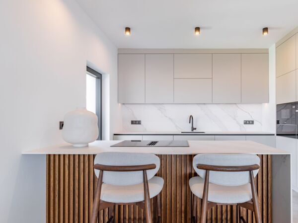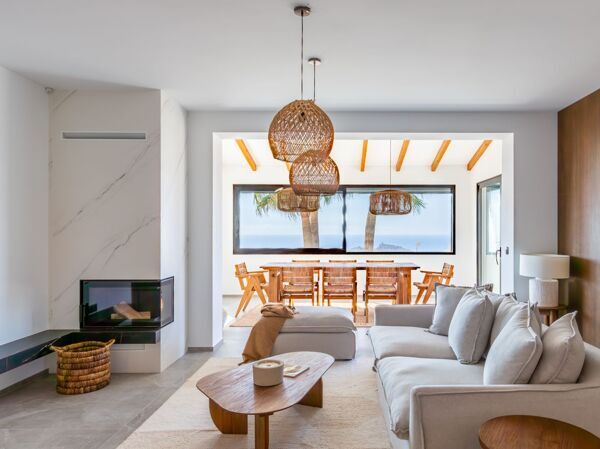 Inside, the villa exudes Mediterranean charm with its open-plan layout and light-filled interiors. Large windows flood the living area with natural light and provide seamless access to the outdoor terraces and landscaped garden. The fully fitted kitchen is integrated into the living space, allowing for easy indoor-outdoor living throughout the seasons.