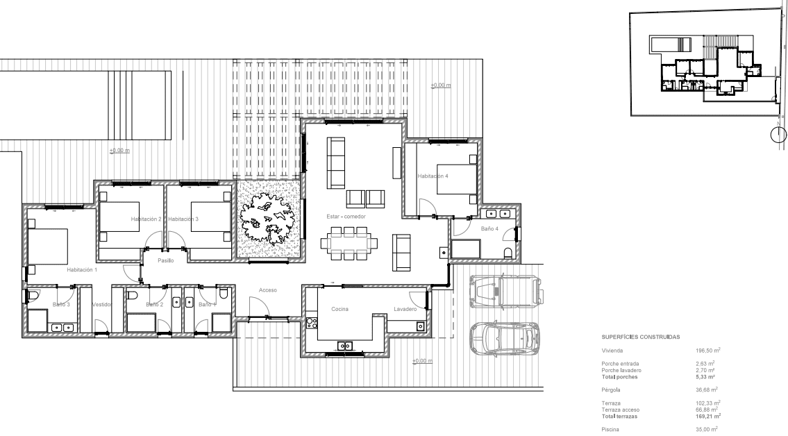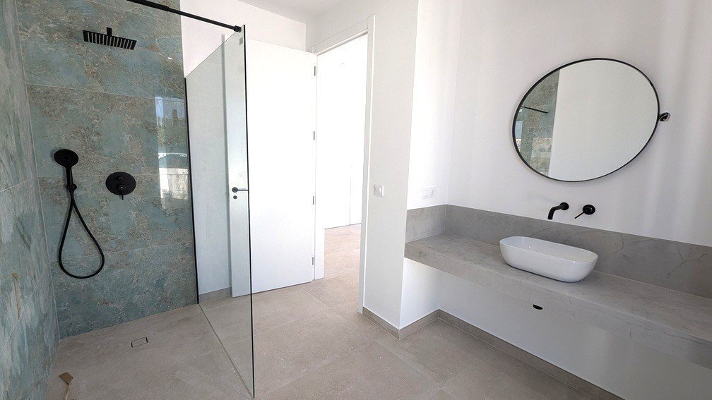 The entire villa is set on one floor, ensuring easy access and a natural flow throughout the home. Large windows and sliding doors allow daylight to flood the interior, creating a bright and airy atmosphere. The open-plan layout enhances the sense of space and is perfect for relaxed living and entertaining alike.