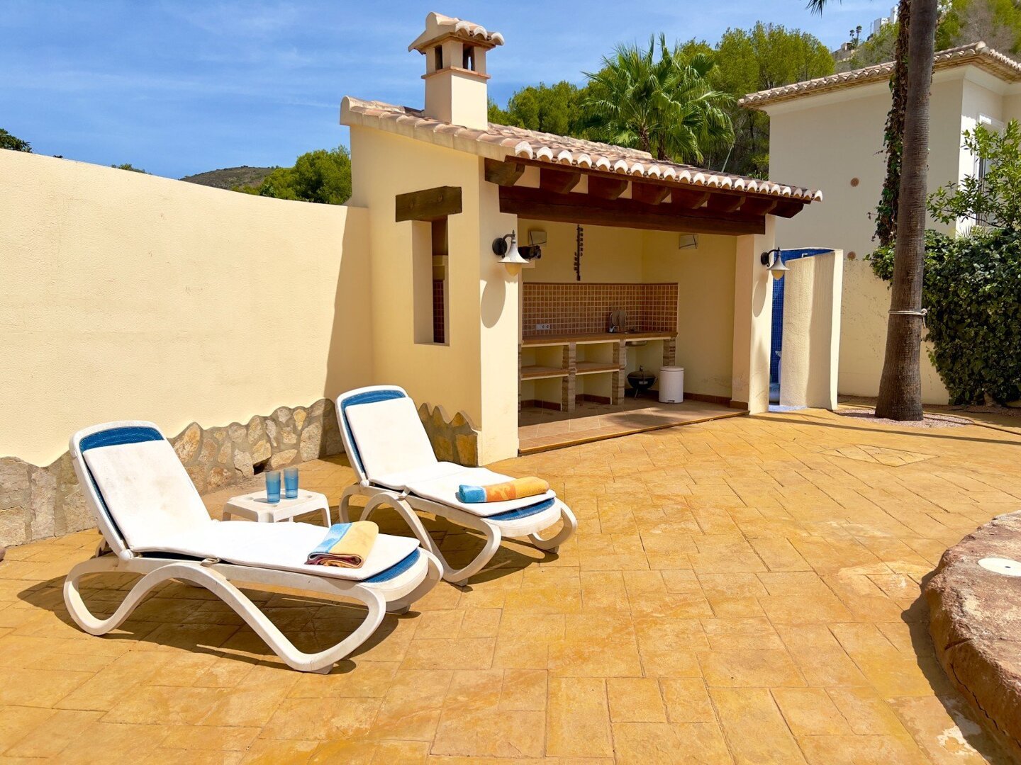 This inviting traditional villa with five bedrooms offers the perfect setting for Mediterranean living. With its generous layout, the living spaces flow seamlessly onto the outdoor terraces, where you can relax with family and friends while enjoying uninterrupted panoramic views over the valley and the sea. The property is situated in the quiet Arnella neighbourhood of Moraira, just a few minutes’ drive from the Blue Flag beach of El Portet, local amenities, and Moraira’s lively town centre.