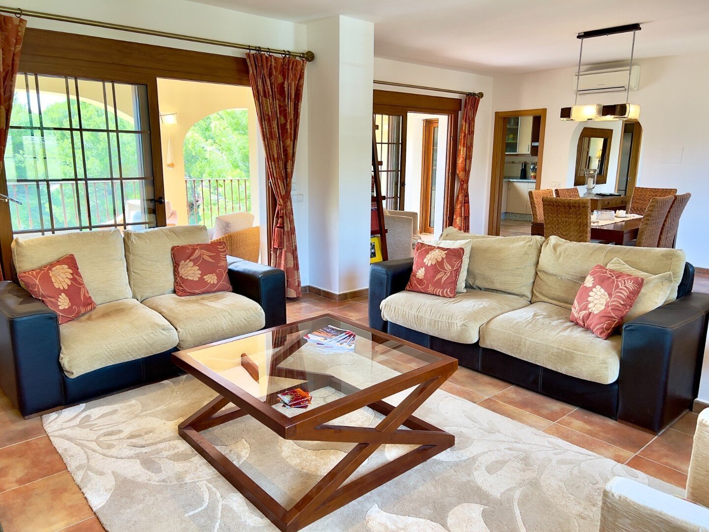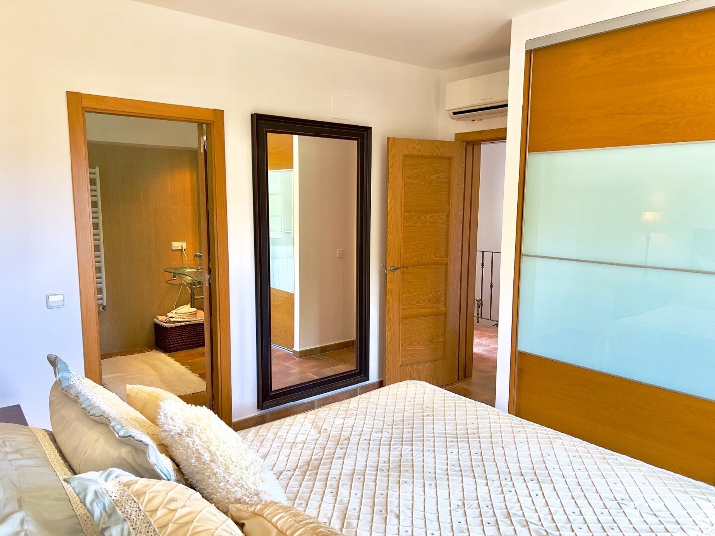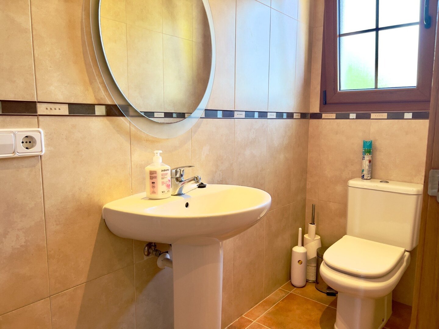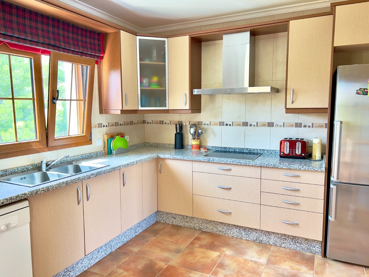 The outdoor areas of this villa are truly a highlight. The heated freeform swimming pool features a waterfall, pool cover, and underwater lighting. Surrounding the pool there is ample space for sunbathing and al fresco dining, while a convenient outdoor shower and a fully equipped summer kitchen with barbecue provide extra comfort. The low-maintenance garden is landscaped with artificial grass, paved areas, Mediterranean plants, and a variety of fruit trees including citrus, fig, pomegranate, and níspero. A gravel terrace with pergola offers an additional shaded seating area.